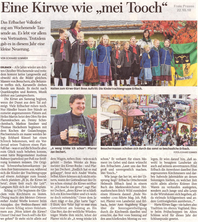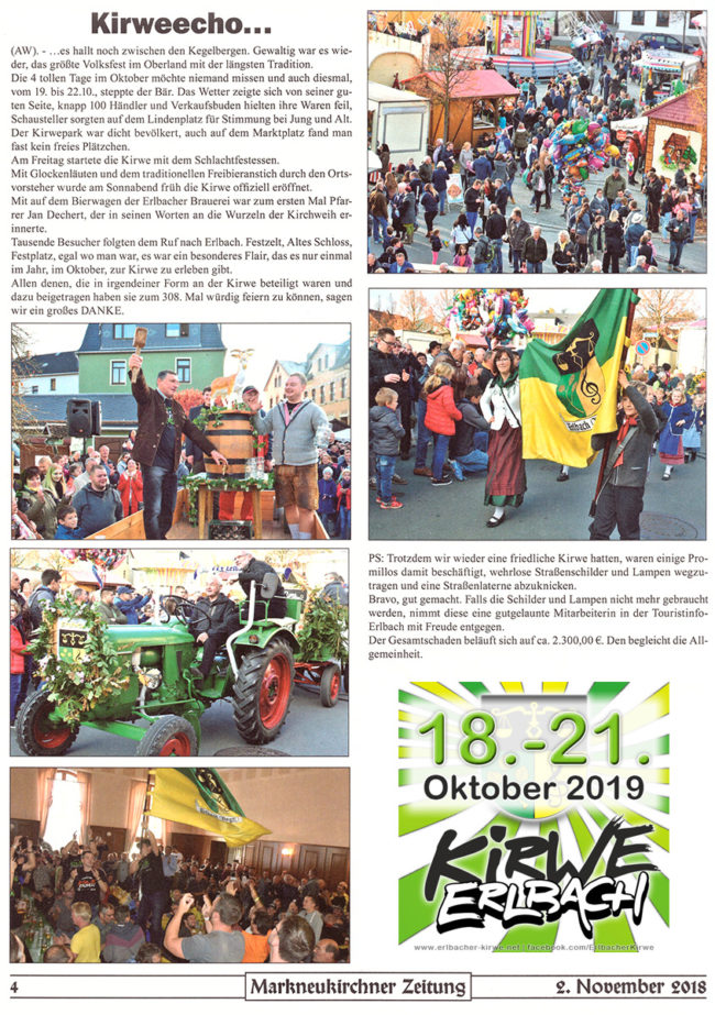 Allen Gästen aus nah und fern ein herzliches Willkommen zur 308. Erlbacher Kirwe vom 19. bis 22. Oktober 2018 Wem köiert die Kirwe? – Unner! Und mei Tooch soll’s die Kirwe gehm! – auch in diesem Jahr präsentiert sich die Erlbacher Kirwe ihren Gästen aus Nah und Fern unter ihrem traditionellen Motto. Lassen Sie sich…