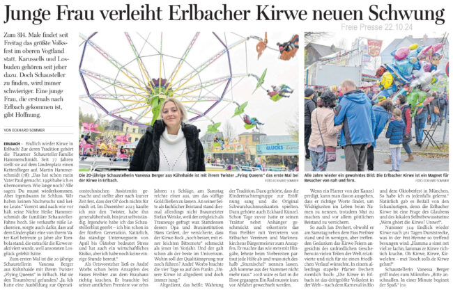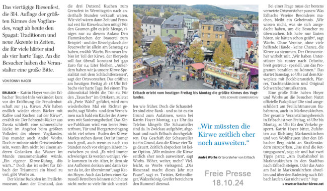 Die 314. Erlbacher Kirwe ist vorbei, die 315. ist schon in den Startlöchern. Ohne Übertreibung kann man sagen, sie war einer der Höhepunkte des Jahres im Oberland. Über vier Tage war Erlbach ein Magnet für viele Vogtländer und Gäste aus allen Landesteilen und auch aus Tschechien.