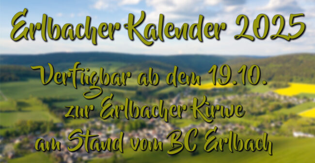 An alle Erlbacher und Freunde: Es gibt ihn wieder! Auch für kommendes Jahr gibt es wieder einen Kalender rund um Erlbach. Dieses Jahr pünktlich zur Erlbacher Kirwe. 😊
