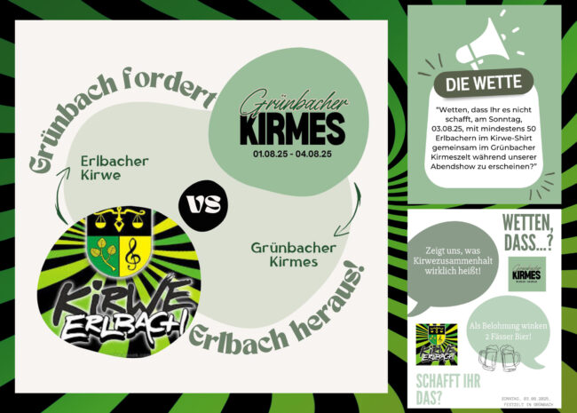 Die Grünbacher Kirmesorganisatoren führen am Kirmessonntag in ihrem Festzelt einen tollen Themenabend durch. Thema: Wetten, das…? Dabei kommt es neben den verschiedenen Saalwetten (Festzeltwetten) auch zu einer Außenwette.