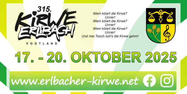 Obec Erlbach, nositel titulu “Obec se vstřícným přístupem k rodině“, vás srdečně zve na 315. Erlbašský jarmark od 17. do 20. října a přeje všem návštěvníkům příjemný pobyt.