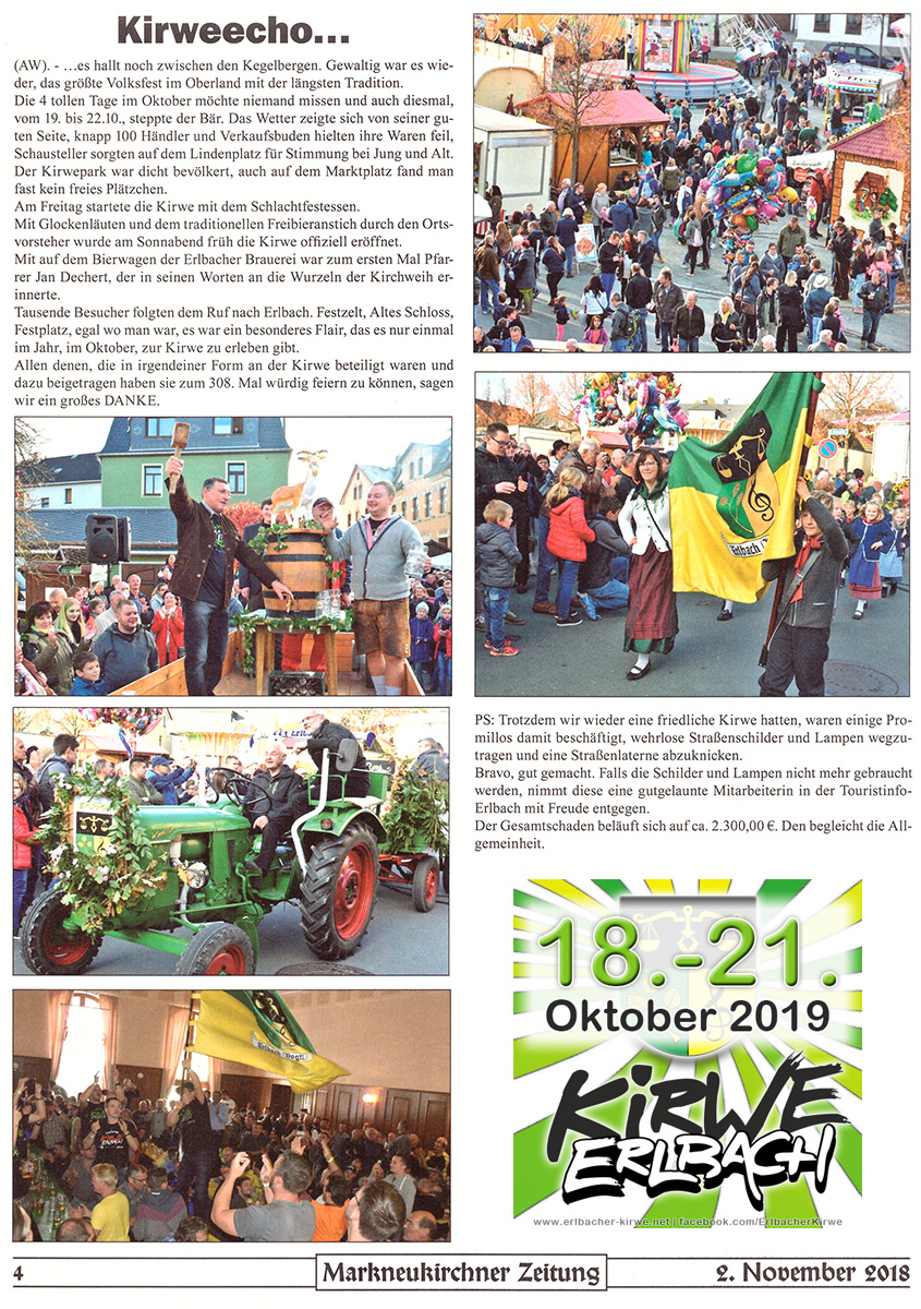 Die 308. Erlbacher Kirwe ist schon wieder Geschichte! Viel zu schnell vergingen die 4-harten-Tage. Mit einem sensationellen Frühschoppen wurde am gestrigen Montag im Alten Schloss die Kirwe verabschiedet! Sehr viele Besucher kamen am Wochenende, bei bestem Kirwe-Wetter, nach Erlbach um live dabei zu sein. Erlbach bedankt sich bei seinen Kirwe-Gästen!