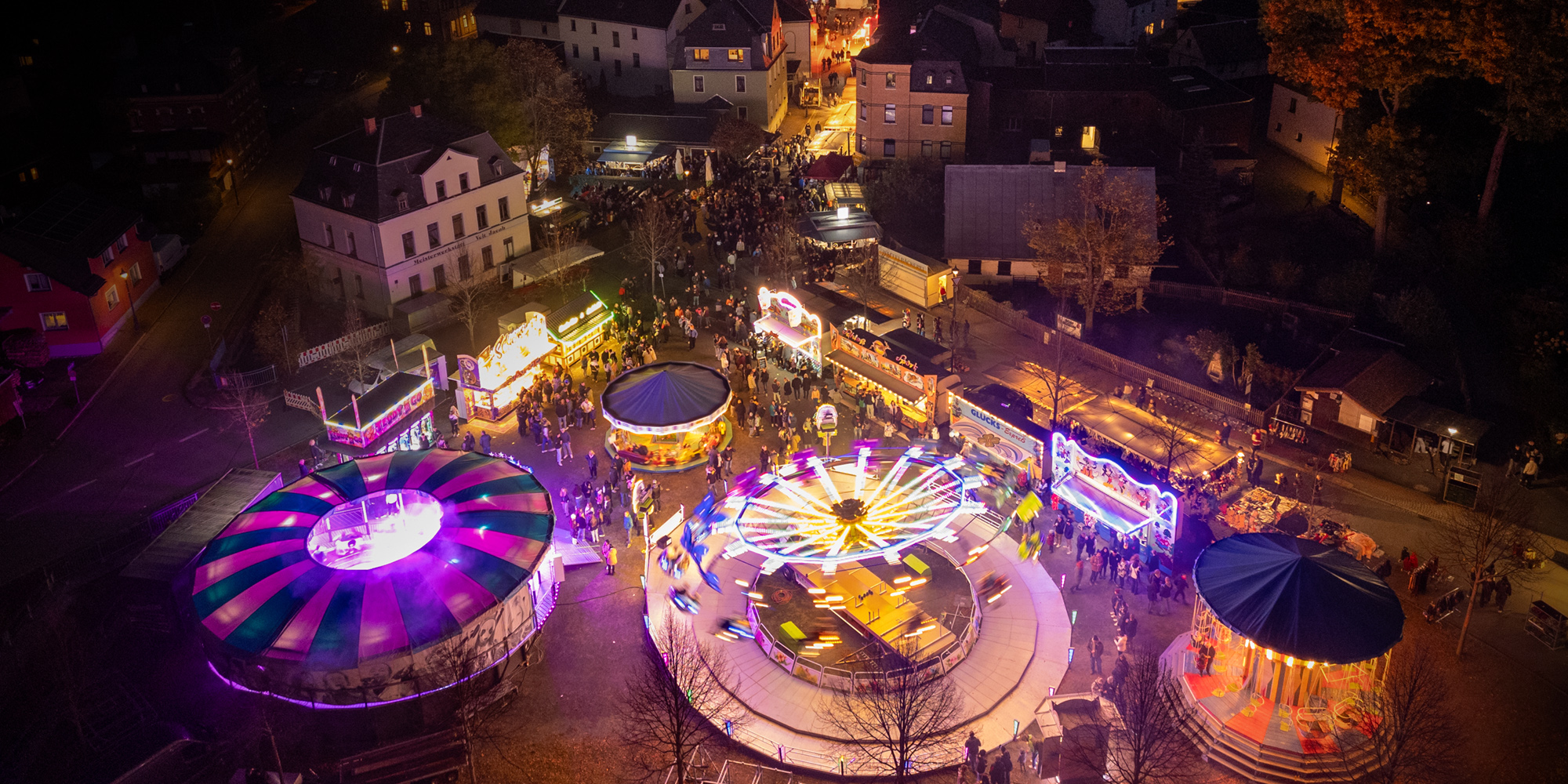 auch dieses Jahr heißt es wieder: last, but not least Luftige Blicke auf den Kirweplatz, teils über Erlbach samt Kegelberge – am Tag und in der Dämmerung 🤩