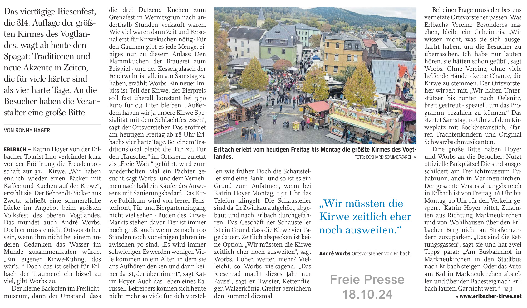 DetailsDie 314. Erlbacher Kirwe ist vorbei, die 315. ist schon in den Startlöchern. Ohne Übertreibung kann man sagen, sie war einer der Höhepunkte des Jahres im Oberland. Über vier Tage war Erlbach ein Magnet für viele Vogtländer und Gäste aus allen Landesteilen und auch aus Tschechien.